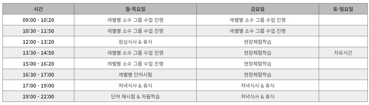 방학연수에서 기초를 익히고, 중,고급 수준까지 도전하길 희망하는 분들에게는 가장 적합한 연수과정입니다. 시간을 절약해서 1년의 효과를 보실 분들에게 추천합니다.